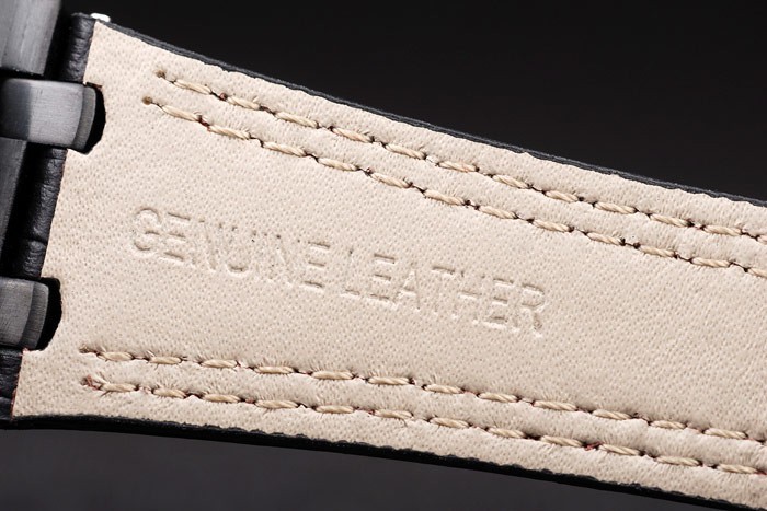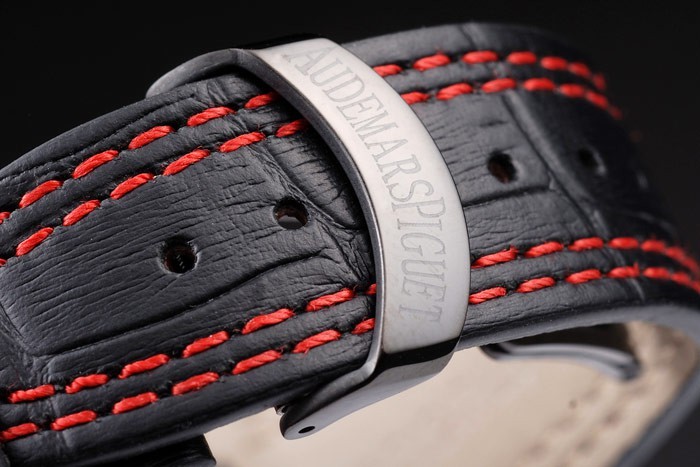 Bracelet: Heat embossed Audemars Piguet black crocodile leather strap with double red stitching and Audemars Piguet engraved ion-plated fold-in clasp