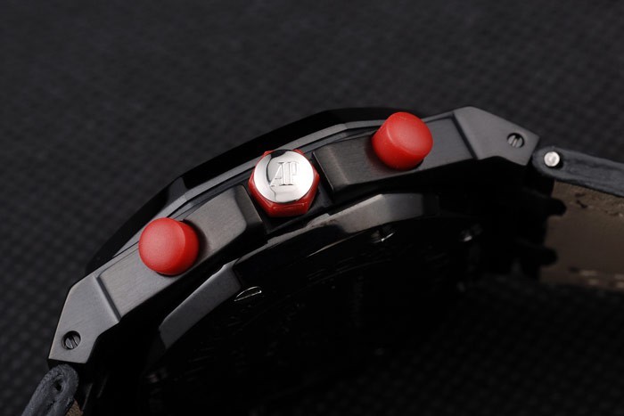 Crown: Red rubber protected hexagonal crown with the initials AP on stainless steel stud plus a red round rubber crown on either side of it