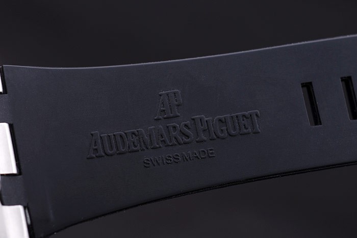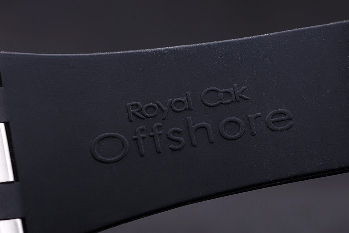 Bracelet: Black rubber strap with heat embossed Audemars Piguet Royal Oak Offshore stamp and an Audemars Piguet inscribed ion-plated hook-buckle clasp