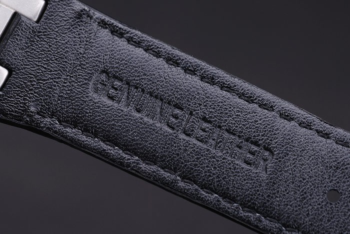 Bracelet: Black crocodile leather strap with white thread stitching and heat embossed Audemars Piguet name and logo and an Audemars Piguet inscribed stainless steel flip-over hook clasp