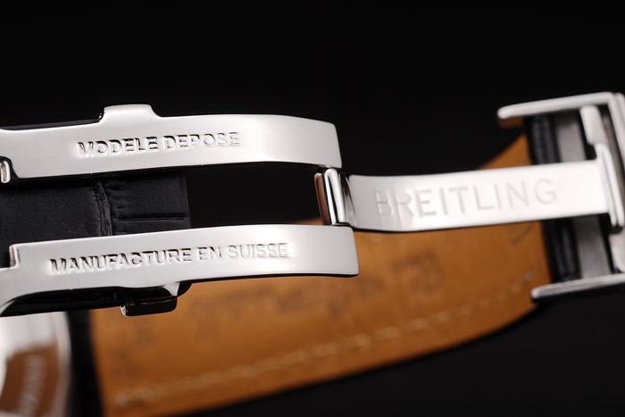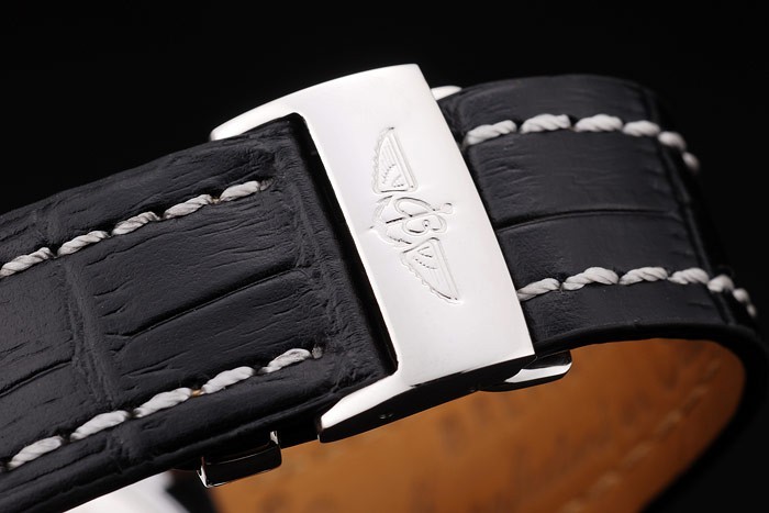 Bracelet: Heat embossed Breitling black crocodile leather strap with white thread stitching and a Breitling logo engraved fold-in stainless steel clasp
