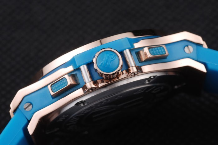 Crown: Cutwork rose-gold crown with ‘H’ engraving and two rectangular push-button crowns on either side, all studded with blue rubber trimmings