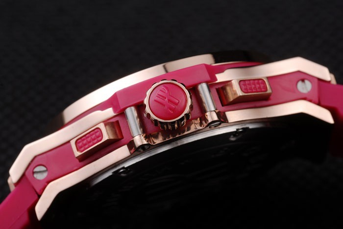 Crown: Cutwork rose-gold crown with ‘H’ engraving and two rectangular push-button crowns on either side, all studded with pink rubber trimmings