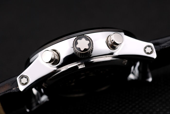 Crown: Ion-plated cutwork crown with MontBlanc logo and two polished stainless steel push button crowns on either side of it