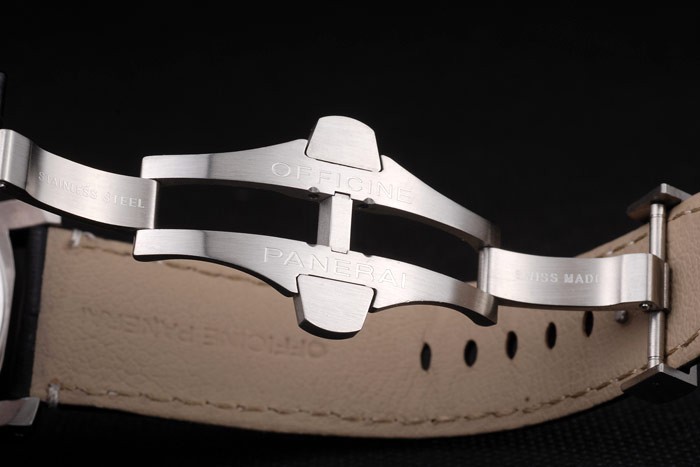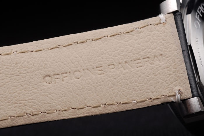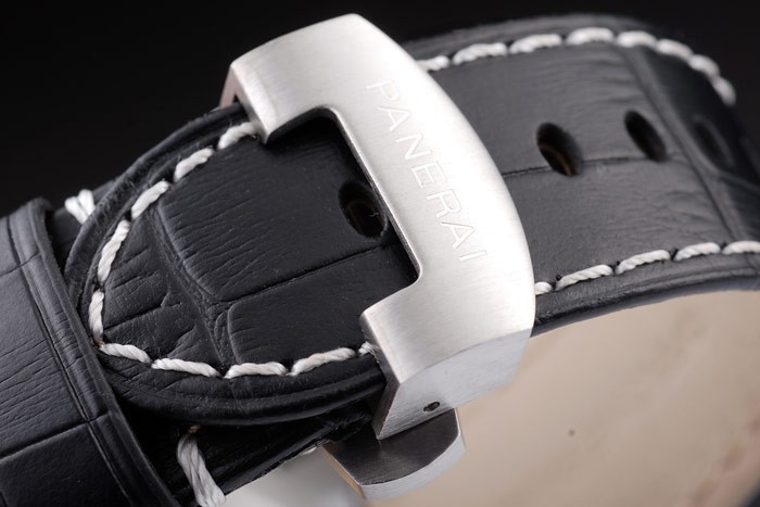 Bracelet: Black crocodile leather strap with white stitching and heat embossed Officine Panerai Italy stamp and polished stainless steel fold-in hook clasp