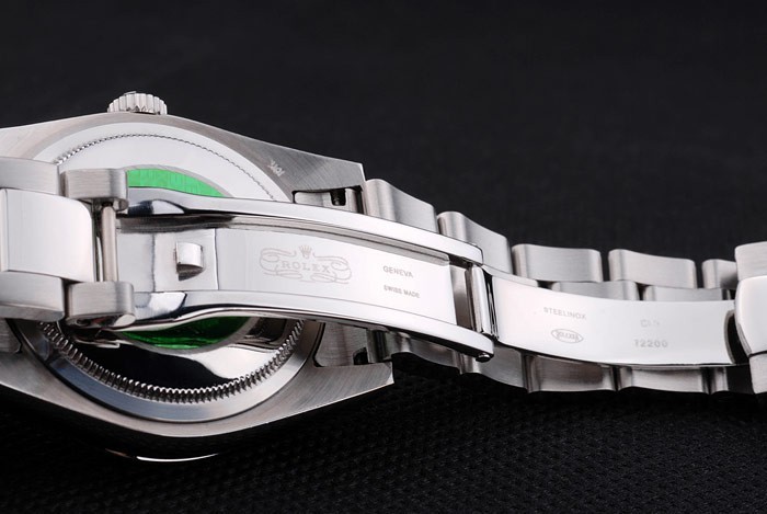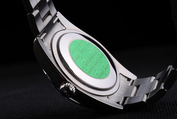 Back: Stainless steel push-in case back with green Rolex engraving stamp