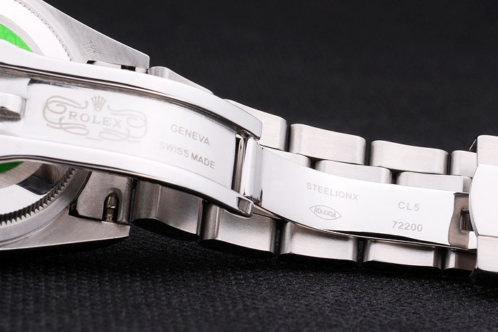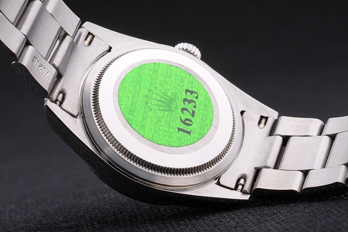 Back: Stainless steel push-in case back with green Rolex engraving stamp